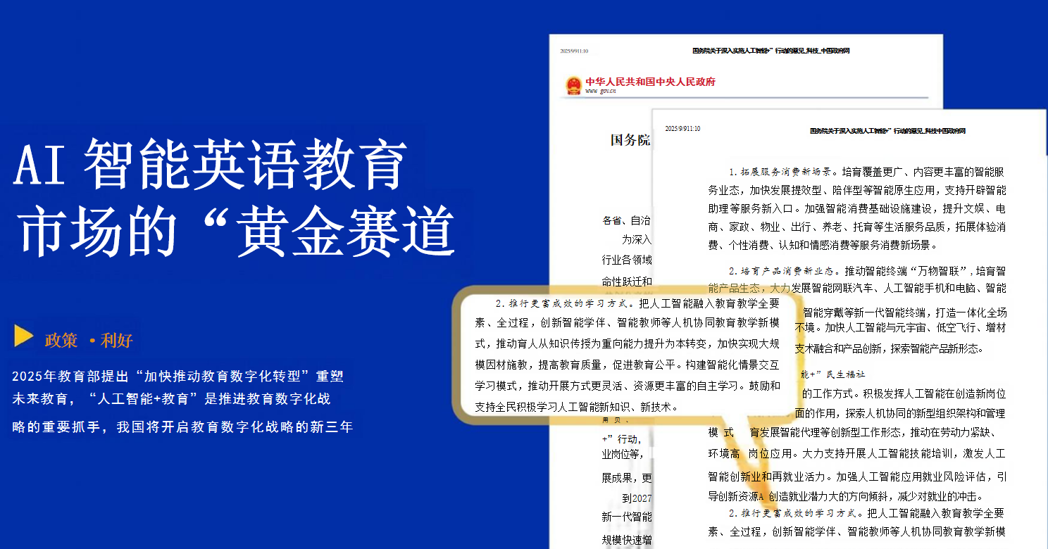 2025 年教育部提出 “加快推动教育数字化转型”,“人工智能 + 教育” 成为推进教育数字化战略的重要抓手,教育数字化新三年征程已然开启。与此同时,英语学习需求旺盛,全球 20 亿人学英语,中国 3 亿英语学习人口,英语是国家规定必考科目,从小学到大学四六级、出国托福、国际贸易都离不开英语,AI 时代互联网信息中英语占比更是高达 53%,英语教育无疑是市场 “黄金赛道”,此时入局,正当其时!